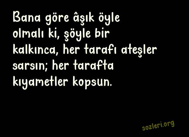 Bana göre âşık öyle olmalı ki, şöyle bir kalkınca, her tarafı ateşler sarsın; her tarafta kıyametler kopsun. ( Şems Tebrizi Aşk )