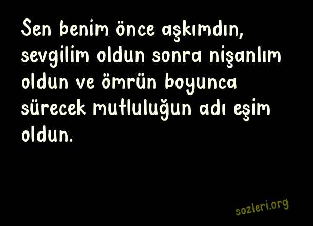 Sen benim önce aşkımdın, sevgilim oldun sonra nişanlım oldun ve ömrün boyunca sürecek mutluluğun adı eşim oldun. ( Sen Benim Aşkımsın )