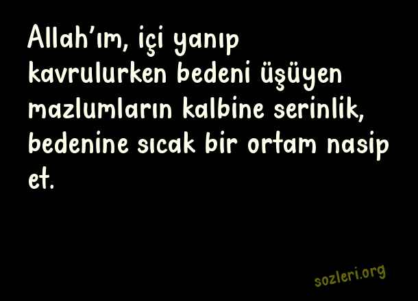 Allah’ım, içi yanıp kavrulurken bedeni üşüyen mazlumların kalbine serinlik, bedenine sıcak bir ortam nasip et. ( Serinlik )