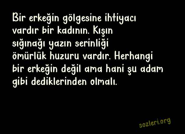Bir erkeğin gölgesine ihtiyacı vardır bir kadının. Kışın sığınağı yazın serinliği ömürlük huzuru vardır. Herhangi bir erkeğin değil ama hani şu adam gibi dediklerinden olmalı. ( Serinlik )