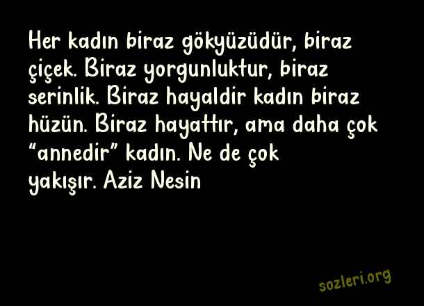 Her kadın biraz gökyüzüdür, biraz çiçek. Biraz yorgunluktur, biraz serinlik. Biraz hayaldir kadın biraz hüzün. Biraz hayattır, ama daha çok “annedir” kadın. Ne de çok yakışır. Aziz Nesin ( Serinlik )
