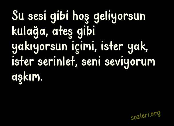 Su sesi gibi hoş geliyorsun kulağa, ateş gibi yakıyorsun içimi, ister yak, ister serinlet, seni seviyorum aşkım. ( Serinlik )