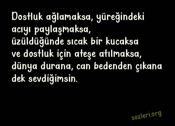 Dostluk ağlamaksa, yüreğindeki acıyı paylaşmaksa, üzüldüğünde sıcak bir kucaksa ve dostluk için ateşe atılmaksa, dünya durana, can bedenden çıkana dek sevdiğimsin. ( Sevda )