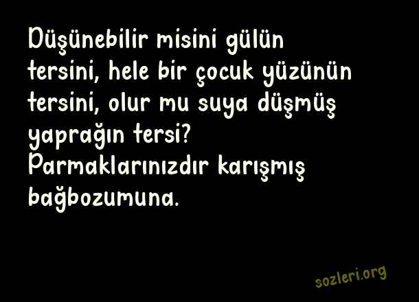 Düşünebilir misini gülün tersini, hele bir çocuk yüzünün tersini, olur mu suya düşmüş yaprağın tersi? Parmaklarınızdır karışmış bağbozumuna. ( Sevda )