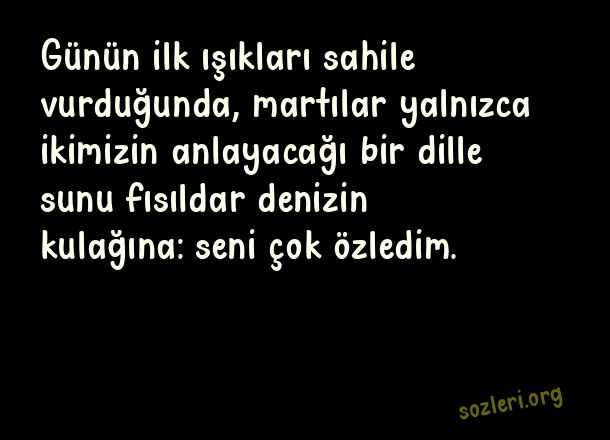Günün ilk ışıkları sahile vurduğunda, martılar yalnızca ikimizin anlayacağı bir dille sunu fısıldar denizin kulağına: seni çok özledim. ( Sevda )