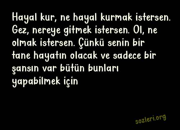 Hayal kur, ne hayal kurmak istersen. Gez, nereye gitmek istersen. Ol, ne olmak istersen. Çünkü senin bir tane hayatın olacak ve sadece bir şansın var bütün bunları yapabilmek için ( Sevda )