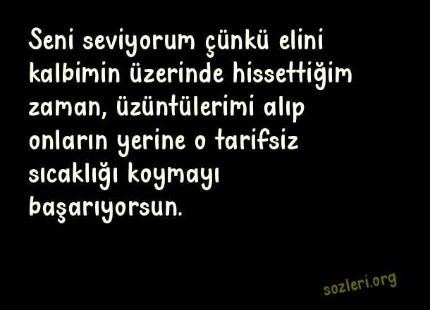 Seni seviyorum çünkü elini kalbimin üzerinde hissettiğim zaman, üzüntülerimi alıp onların yerine o tarifsiz sıcaklığı koymayı başarıyorsun. ( Sevda )