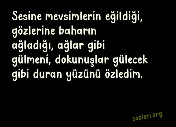 Sesine mevsimlerin eğildiği, gözlerine baharın ağladığı, ağlar gibi gülmeni, dokunuşlar gülecek gibi duran yüzünü özledim. ( Sevda )
