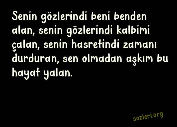 Senin gözlerindi beni benden alan, senin gözlerindi kalbimi çalan, senin hasretindi zamanı durduran, sen olmadan aşkım bu hayat yalan. ( Sevenler İçin Mesajlar )