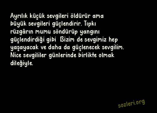 Ayrılık küçük sevgileri öldürür ama büyük sevgileri güçlendirir. Tıpkı rüzgârın mumu söndürüp yangını güçlendirdiği gibi… Bizim de sevgimiz hep yaşayacak ve daha da güçlenecek sevgilim. Nice sevgililer günlerinde birlikte olmak dileğiyle. ( En Güzel Sevgililer Günü )