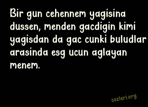 Bir gun cehennem yagisina dussen, menden gacdigin kimi yagisdan da gac cunki buludlar arasinda esg ucun aglayan menem. ( Azerice Sevgi )