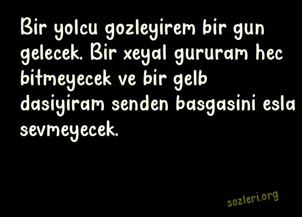 Bir yolcu gozleyirem bir gun gelecek. Bir xeyal gururam hec bitmeyecek ve bir gelb dasiyiram senden basgasini esla sevmeyecek. ( Azerice Sevgi )