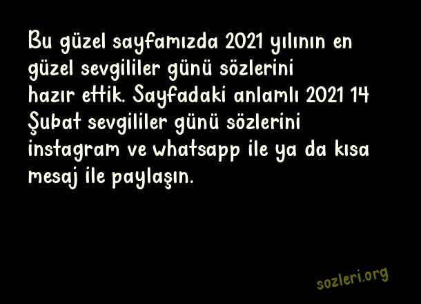 Bu güzel sayfamızda 2021 yılının en güzel sevgililer günü sözlerini hazır ettik. Sayfadaki anlamlı 2021 14 Şubat sevgililer günü sözlerini instagram ve whatsapp ile ya da kısa mesaj ile paylaşın. ( 2021 Sevgililer Günü )