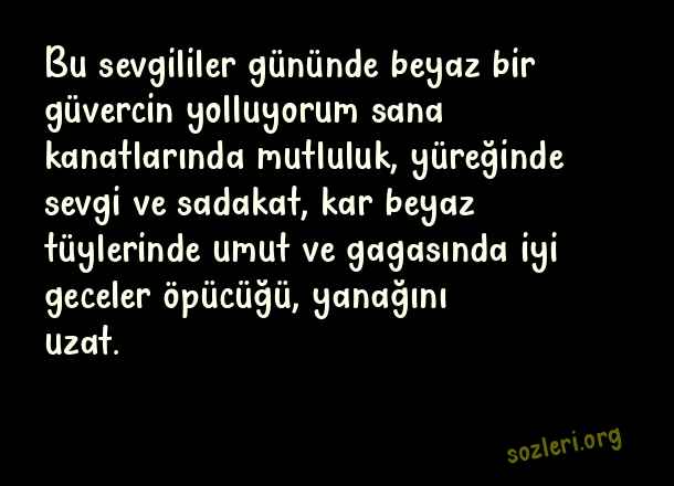 Bu sevgililer gününde beyaz bir güvercin yolluyorum sana kanatlarında mutluluk, yüreğinde sevgi ve sadakat, kar beyaz tüylerinde umut ve gagasında iyi geceler öpücüğü, yanağını uzat. ( 14 Şubat Sevgililer Günü İle İlgili Mesajlar )