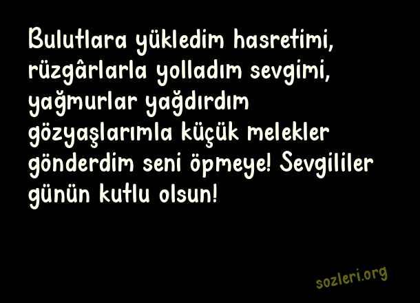Bulutlara yükledim hasretimi, rüzgârlarla yolladım sevgimi, yağmurlar yağdırdım gözyaşlarımla küçük melekler gönderdim seni öpmeye! Sevgililer günün kutlu olsun! ( 14 Şubat Sevgililer Günü İle İlgili Mesajlar )