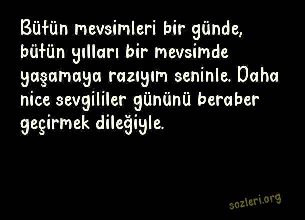Bütün mevsimleri bir günde, bütün yılları bir mevsimde yaşamaya razıyım seninle. Daha nice sevgililer gününü beraber geçirmek dileğiyle. ( En Güzel Sevgililer Günü )