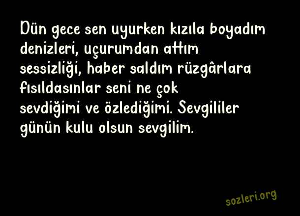 Dün gece sen uyurken kızıla boyadım denizleri, uçurumdan attım sessizliği, haber saldım rüzgârlara fısıldasınlar seni ne çok sevdiğimi ve özlediğimi. Sevgililer günün kulu olsun sevgilim. ( 2021 Sevgililer Günü )