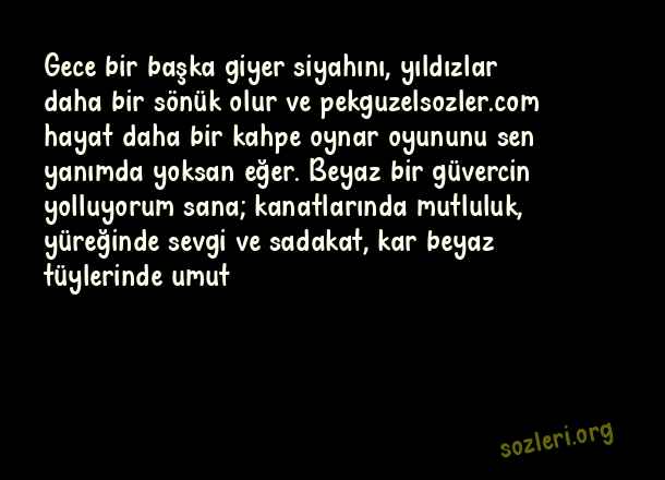 Gece bir başka giyer siyahını, yıldızlar daha bir sönük olur ve hayat daha bir kahpe oynar oyununu sen yanımda yoksan eğer. Beyaz bir güvercin yolluyorum sana; kanatlarında mutluluk, yüreğinde sevgi ve sadakat, kar beyaz tüylerinde umut ( 2021 Sevgililer Günü )