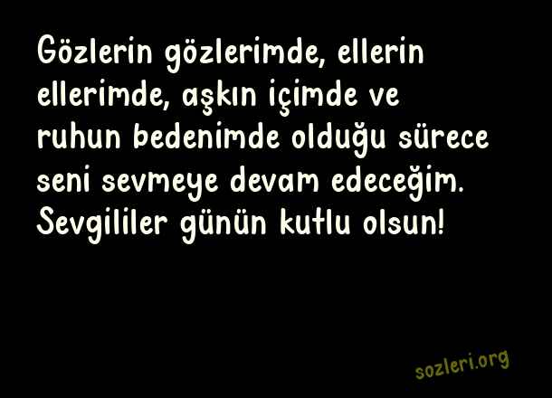 Gözlerin gözlerimde, ellerin ellerimde, aşkın içimde ve ruhun bedenimde olduğu sürece seni sevmeye devam edeceğim. Sevgililer günün kutlu olsun! ( 14 Şubat Sevgililer Günü )