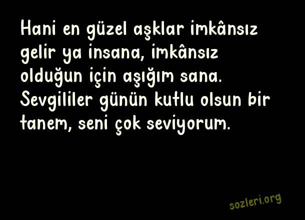 Hani en güzel aşklar imkânsız gelir ya insana, imkânsız olduğun için aşığım sana. Sevgililer günün kutlu olsun bir tanem, seni çok seviyorum. ( En Güzel Sevgililer Günü )