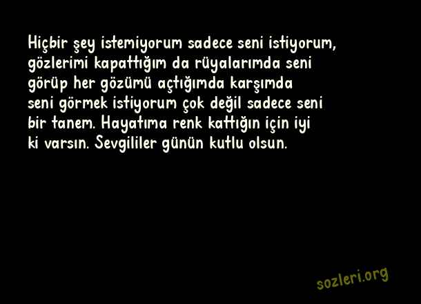 Hiçbir şey istemiyorum sadece seni istiyorum, gözlerimi kapattığım da rüyalarımda seni görüp her gözümü açtığımda karşımda seni görmek istiyorum çok değil sadece seni bir tanem. Hayatıma renk kattığın için iyi ki varsın. Sevgililer günün kutlu olsun. ( 14 Şubat Sevgililer Günü )