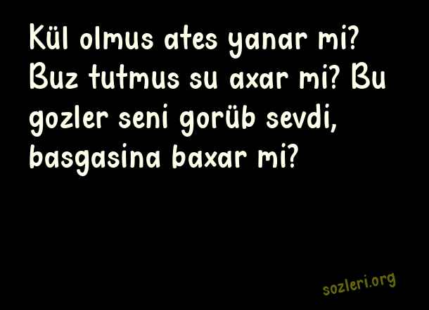 Kül olmus ates yanar mi? Buz tutmus su axar mi? Bu gozler seni gorüb sevdi, basgasina baxar mi? ( Azerice Sevgi )