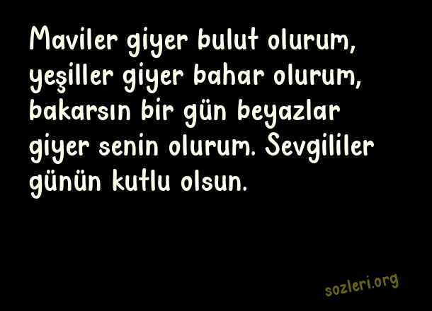Maviler giyer bulut olurum, yeşiller giyer bahar olurum, bakarsın bir gün beyazlar giyer senin olurum. Sevgililer günün kutlu olsun. ( 14 Şubat Sevgililer Günü İle İlgili Mesajlar )