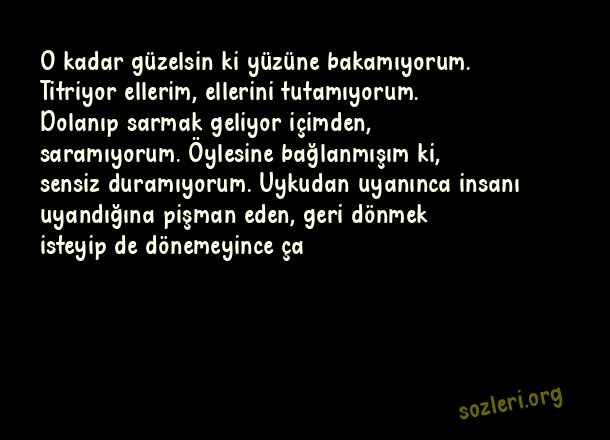 O kadar güzelsin ki yüzüne bakamıyorum. Titriyor ellerim, ellerini tutamıyorum. Dolanıp sarmak geliyor içimden, saramıyorum. Öylesine bağlanmışım ki, sensiz duramıyorum. Uykudan uyanınca insanı uyandığına pişman eden, geri dönmek isteyip de dönemeyince ça ( 14 Şubat Sevgililer Günü İle İlgili Mesajlar )