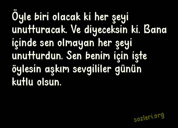 Öyle biri olacak ki her şeyi unutturacak. Ve diyeceksin ki. Bana içinde sen olmayan her şeyi unutturdun. Sen benim için işte öylesin aşkım sevgililer günün kutlu olsun. ( En Güzel Sevgililer Günü )