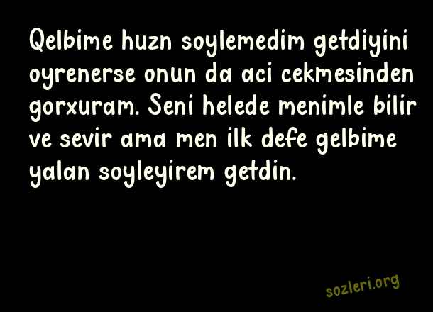 Qelbime huzn soylemedim getdiyini oyrenerse onun da aci cekmesinden gorxuram. Seni helede menimle bilir ve sevir ama men ilk defe gelbime yalan soyleyirem getdin. ( Azerice Sevgi )
