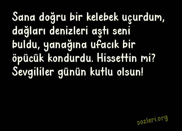 Sana doğru bir kelebek uçurdum, dağları denizleri aştı seni buldu, yanağına ufacık bir öpücük kondurdu. Hissettin mi? Sevgililer günün kutlu olsun! ( 14 Şubat Sevgililer Günü İle İlgili Mesajlar )