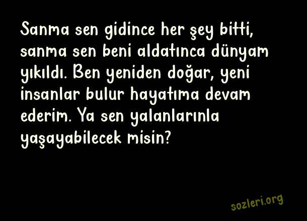 Sanma sen gidince her şey bitti, sanma sen beni aldatınca dünyam yıkıldı. Ben yeniden doğar, yeni insanlar bulur hayatıma devam ederim. Ya sen yalanlarınla yaşayabilecek misin? ( Aldatan Sevgiliye Kapak Sözler )