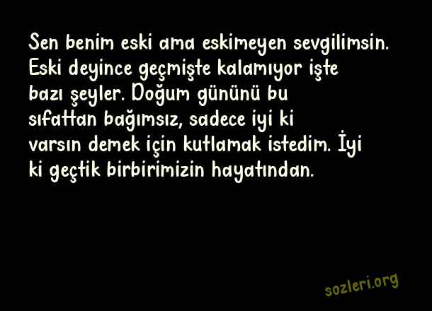 Sen benim eski ama eskimeyen sevgilimsin. Eski deyince geçmişte kalamıyor işte bazı şeyler. Doğum gününü bu sıfattan bağımsız, sadece iyi ki varsın demek için kutlamak istedim. İyi ki geçtik birbirimizin hayatından. ( Eski Sevgiliye Doğum Günü )