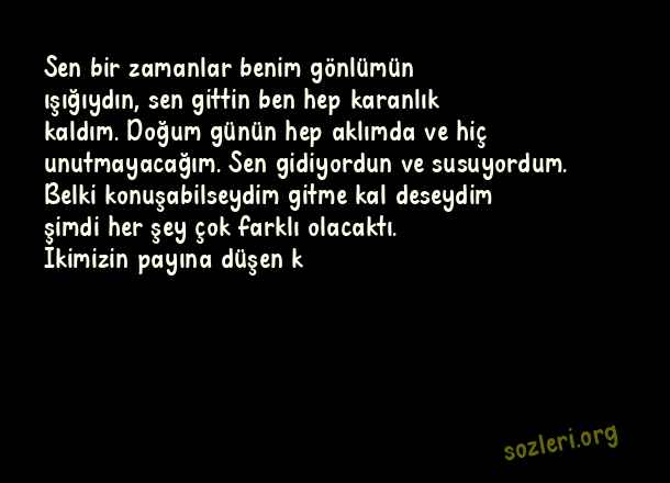 Sen bir zamanlar benim gönlümün ışığıydın, sen gittin ben hep karanlık kaldım. Doğum günün hep aklımda ve hiç unutmayacağım. Sen gidiyordun ve susuyordum. Belki konuşabilseydim gitme kal deseydim şimdi her şey çok farklı olacaktı. İkimizin payına düşen k ( Eski Sevgiliye Doğum Günü )