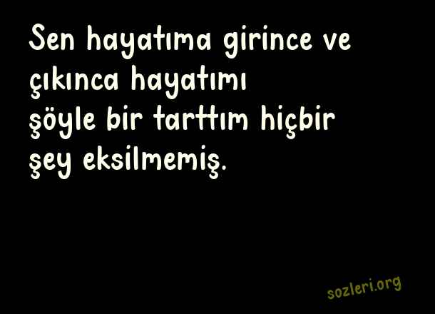 Sen hayatıma girince ve çıkınca hayatımı şöyle bir tarttım hiçbir şey eksilmemiş. ( Aldatan Sevgiliye Kapak Sözler )