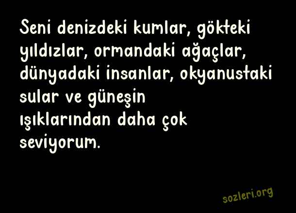 Seni denizdeki kumlar, gökteki yıldızlar, ormandaki ağaçlar, dünyadaki insanlar, okyanustaki sular ve güneşin ışıklarından daha çok seviyorum. ( 2021 Sevgililer Günü )
