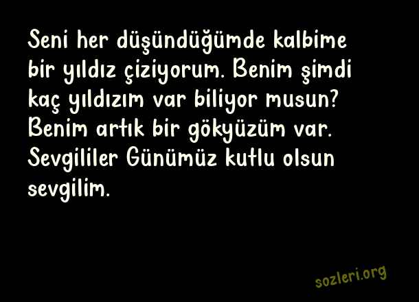 Seni her düşündüğümde kalbime bir yıldız çiziyorum. Benim şimdi kaç yıldızım var biliyor musun? Benim artık bir gökyüzüm var. Sevgililer Günümüz kutlu olsun sevgilim. ( Erkeğe Sevgililer Günü )