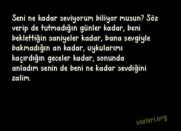 Seni ne kadar seviyorum biliyor musun? Söz verip de tutmadığın günler kadar, beni beklettiğin saniyeler kadar, bana sevgiyle bakmadığın an kadar, uykularımı kaçırdığın geceler kadar, sonunda anladım senin de beni ne kadar sevdiğini zalim. ( En Güzel Sevgililer Günü )