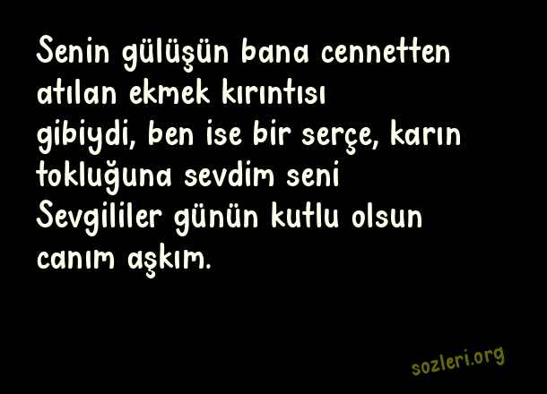 Senin gülüşün bana cennetten atılan ekmek kırıntısı gibiydi, ben ise bir serçe, karın tokluğuna sevdim seni… Sevgililer günün kutlu olsun canım aşkım. ( 2022 Sevgililer Günü )