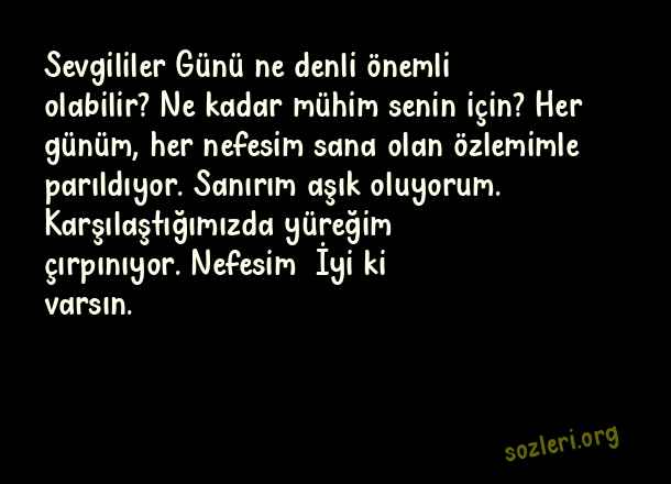 Sevgililer Günü ne denli önemli olabilir? Ne kadar mühim senin için? Her günüm, her nefesim sana olan özlemimle parıldıyor. Sanırım aşık oluyorum. Karşılaştığımızda yüreğim çırpınıyor. Nefesim… İyi ki varsın. ( Erkeğe Sevgililer Günü )
