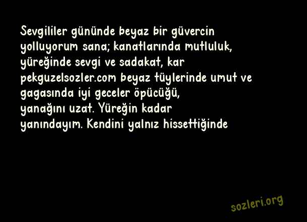Sevgililer gününde beyaz bir güvercin yolluyorum sana; kanatlarında mutluluk, yüreğinde sevgi ve sadakat, kar beyaz tüylerinde umut ve gagasında iyi geceler öpücüğü, yanağını uzat. Yüreğin kadar yanındayım. Kendini yalnız hissettiğinde ( 14 Şubat Sevgililer Günü İle İlgili Mesajlar )