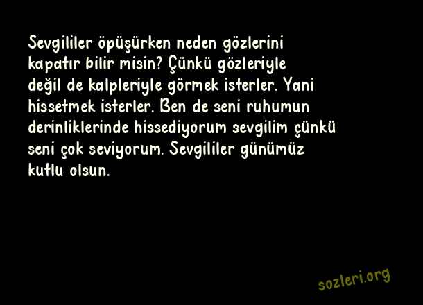 Sevgililer öpüşürken neden gözlerini kapatır bilir misin? Çünkü gözleriyle değil de kalpleriyle görmek isterler. Yani hissetmek isterler. Ben de seni ruhumun derinliklerinde hissediyorum sevgilim çünkü seni çok seviyorum. Sevgililer günümüz kutlu olsun. ( 2021 Sevgililer Günü )
