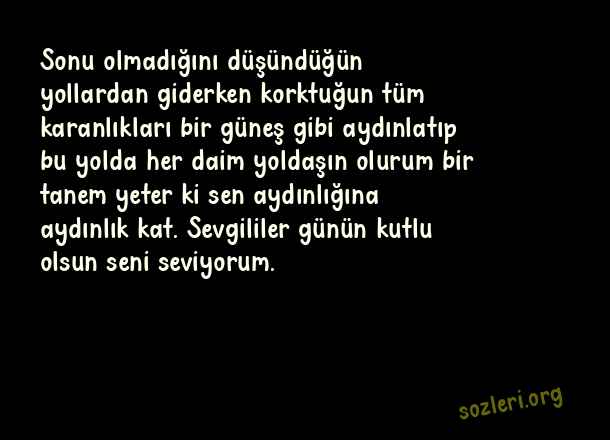 Sonu olmadığını düşündüğün yollardan giderken korktuğun tüm karanlıkları bir güneş gibi aydınlatıp bu yolda her daim yoldaşın olurum bir tanem yeter ki sen aydınlığına aydınlık kat. Sevgililer günün kutlu olsun seni seviyorum. ( 14 Şubat Sevgililer Günü )