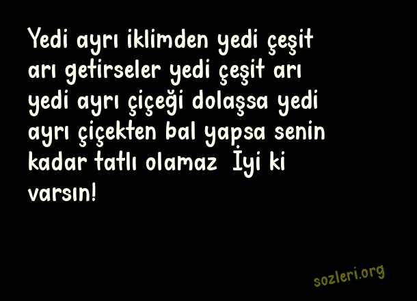Yedi ayrı iklimden yedi çeşit arı getirseler yedi çeşit arı yedi ayrı çiçeği dolaşsa yedi ayrı çiçekten bal yapsa senin kadar tatlı olamaz… İyi ki varsın! ( 14 Şubat Sevgililer Günü İle İlgili Mesajlar )