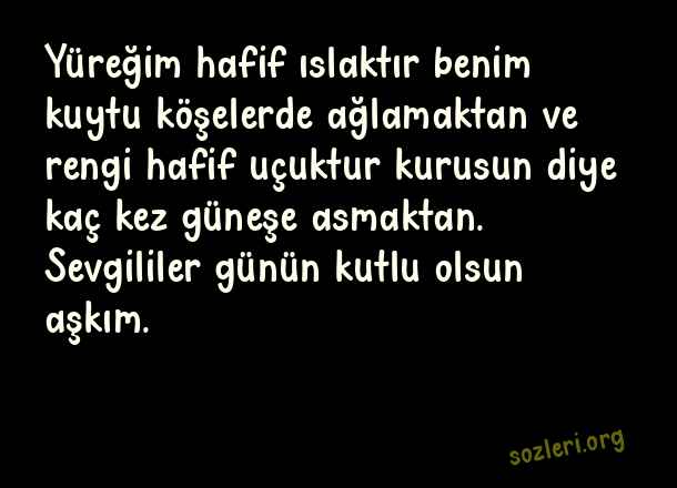 Yüreğim hafif ıslaktır benim kuytu köşelerde ağlamaktan ve rengi hafif uçuktur kurusun diye kaç kez güneşe asmaktan. Sevgililer günün kutlu olsun aşkım. ( 14 Şubat Sevgililer Günü İle İlgili Mesajlar )