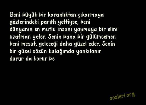 Beni büyük bir karanlıktan çıkarmaya gözlerindeki parıltı yettiyse, beni dünyanın en mutlu insanı yapmaya bir elini uzatman yeter. Senin bana bir gülümsemen beni mesut, geleceği daha güzel eder. Senin bir güzel sözün kulağımda yankılanır durur da korur be ( Sevgiliye Aşk Notları )