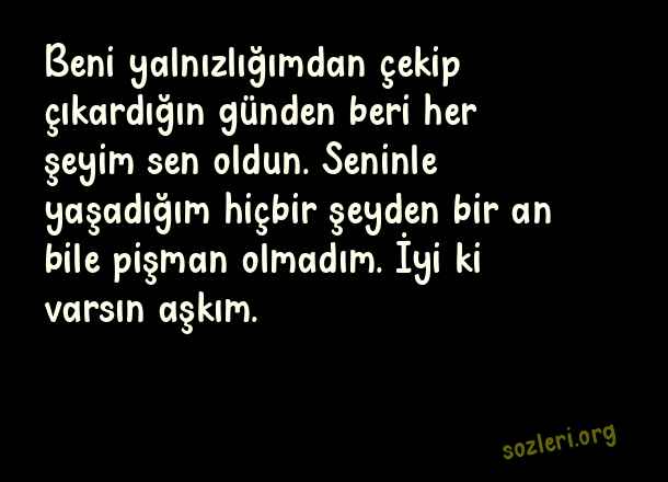 Beni yalnızlığımdan çekip çıkardığın günden beri her şeyim sen oldun. Seninle yaşadığım hiçbir şeyden bir an bile pişman olmadım. İyi ki varsın aşkım. ( Sevgiliye Aşk Notları )