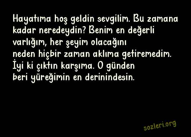 Hayatıma hoş geldin sevgilim. Bu zamana kadar neredeydin? Benim en değerli varlığım, her şeyim olacağını neden hiçbir zaman aklıma getiremedim. İyi ki çıktın karşıma. O günden beri yüreğimin en derinindesin. ( Sevgiliye Aşk Notları )