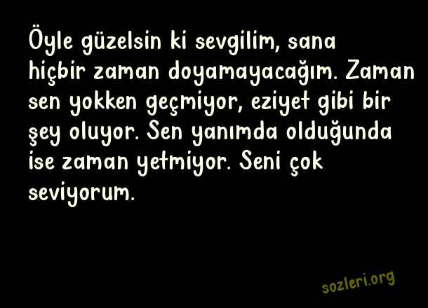 Öyle güzelsin ki sevgilim, sana hiçbir zaman doyamayacağım. Zaman sen yokken geçmiyor, eziyet gibi bir şey oluyor. Sen yanımda olduğunda ise zaman yetmiyor. Seni çok seviyorum. ( Sevgiliye Aşk Notları )