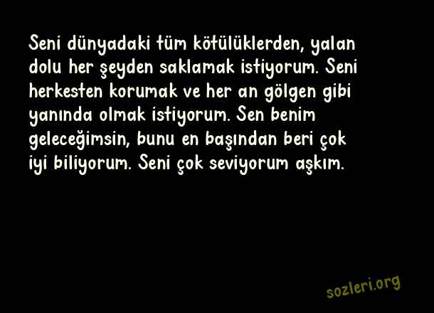 Seni dünyadaki tüm kötülüklerden, yalan dolu her şeyden saklamak istiyorum. Seni herkesten korumak ve her an gölgen gibi yanında olmak istiyorum. Sen benim geleceğimsin, bunu en başından beri çok iyi biliyorum. Seni çok seviyorum aşkım. ( Sevgiliye Aşk Notları )